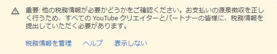アドセンスのヘルプページにも「お住まいの国または地域によっては、Google に税務情報をお知らせいただく必要がある場合があります」とありましたが、今回アドセンス管理画面に出てきたお知らせを読む限り、どうやら税務情報の登録は必須になったと考えられそうです。